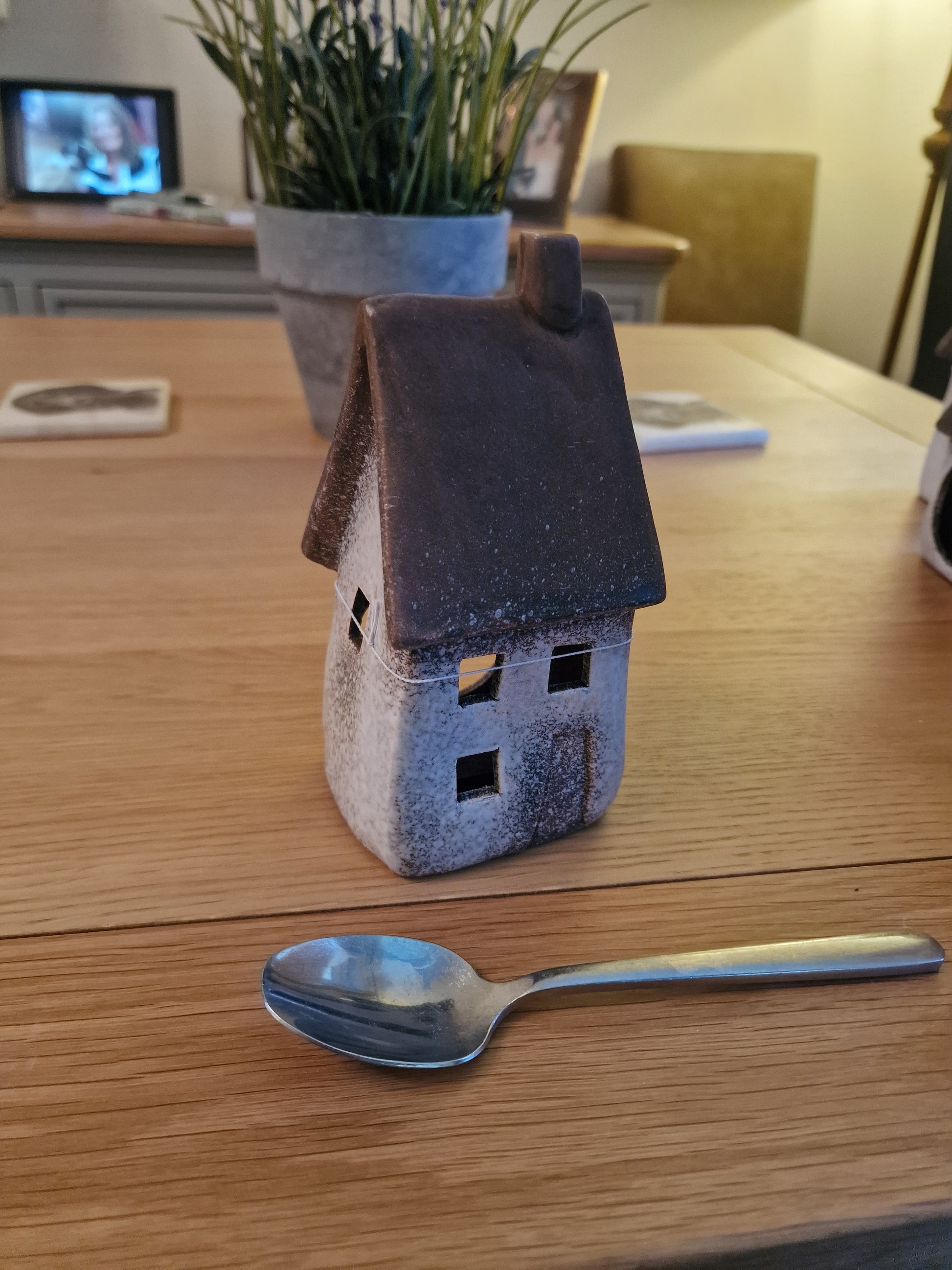 Introducing this wonky windlight house ornament, a beautiful addition to elevate your home decor and Tealights. This striking piece will effortlessly enhance any living space. Boasting a speckled white design, this ornament adds a touch of uniqueness and charm, making it a must-have for any interior design lover. This item has been hand finished with care meaning each object is unique with its own individual imperfections. A truly one-of-a-kind piece with a rustic aesthetic. 2 assorted designs, sold individually Size: 17.3cm x 8.1cm x 7.8cm
