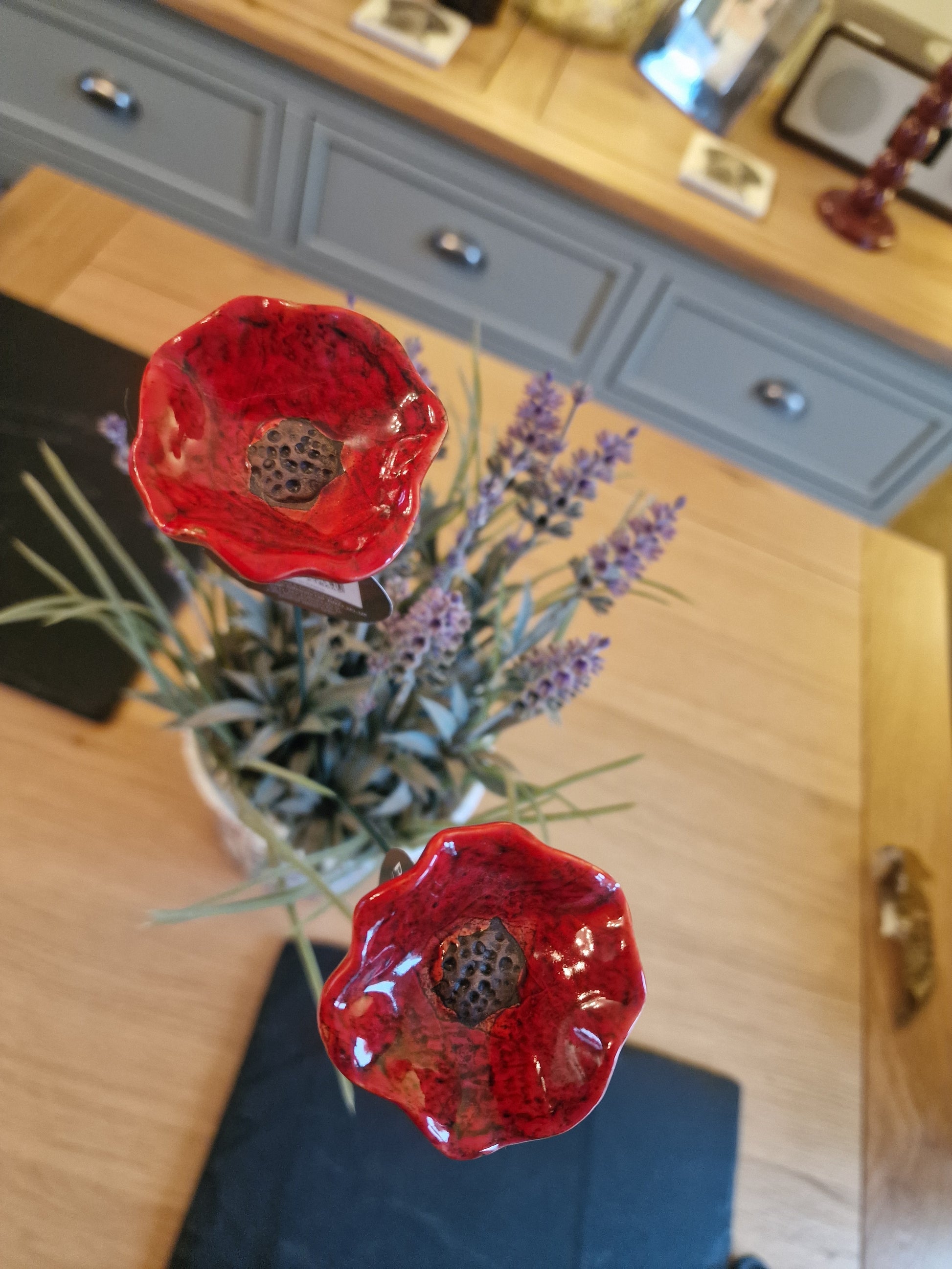 Stunning ceramic poppy outdoor garden stake flower decoration. Suitable for placing around the garden in plant pots and flower beds, adding a vibrant red colour and character to your outdoor space. Poopy Stakes only,