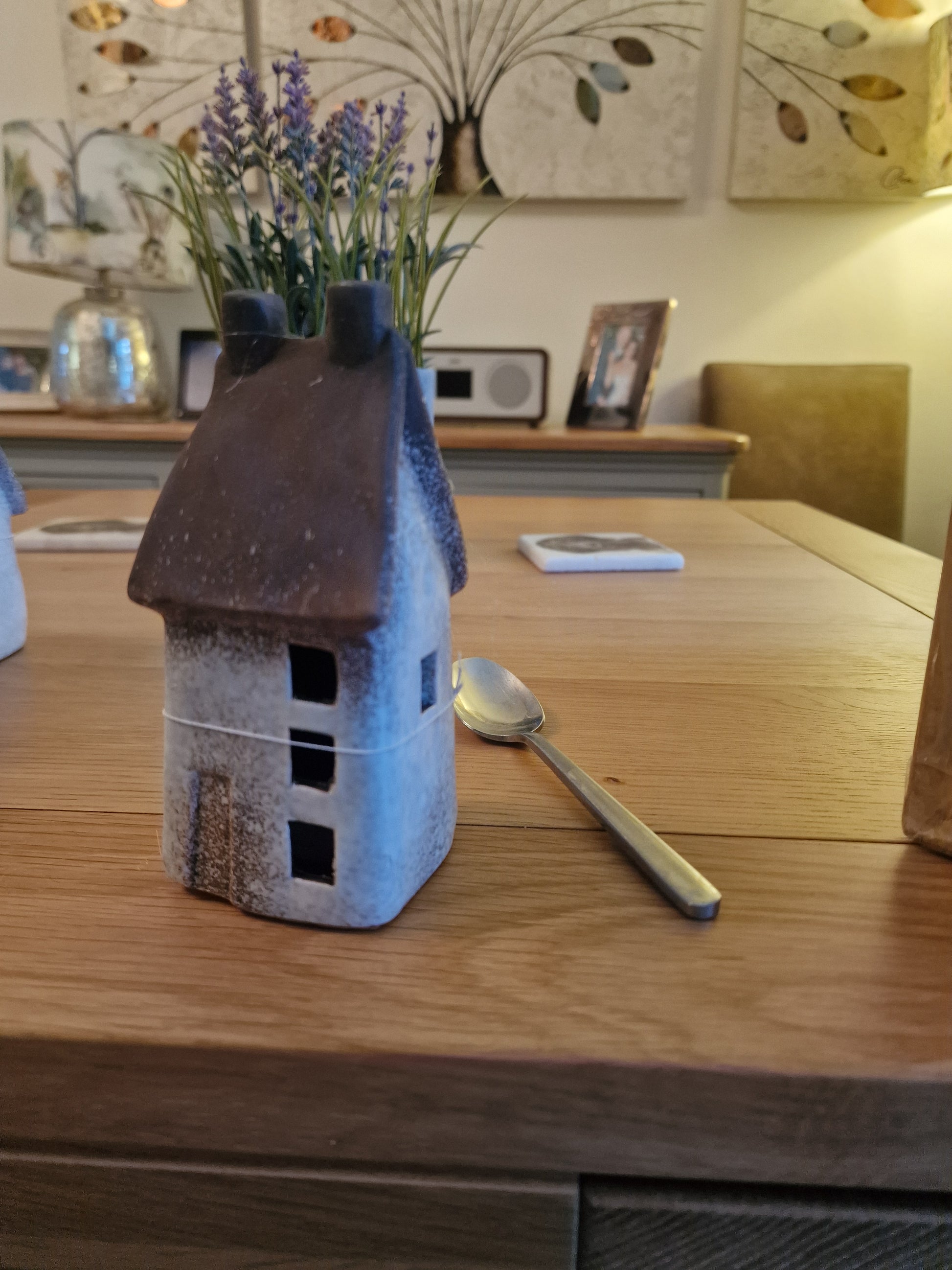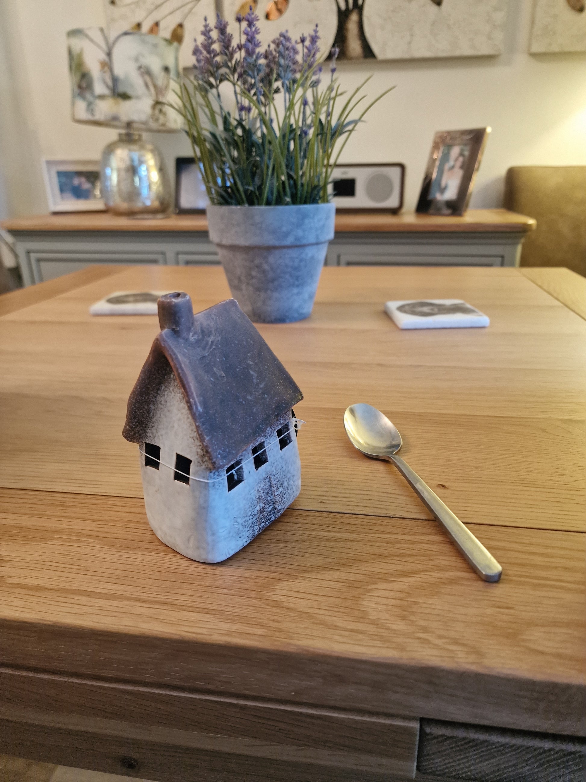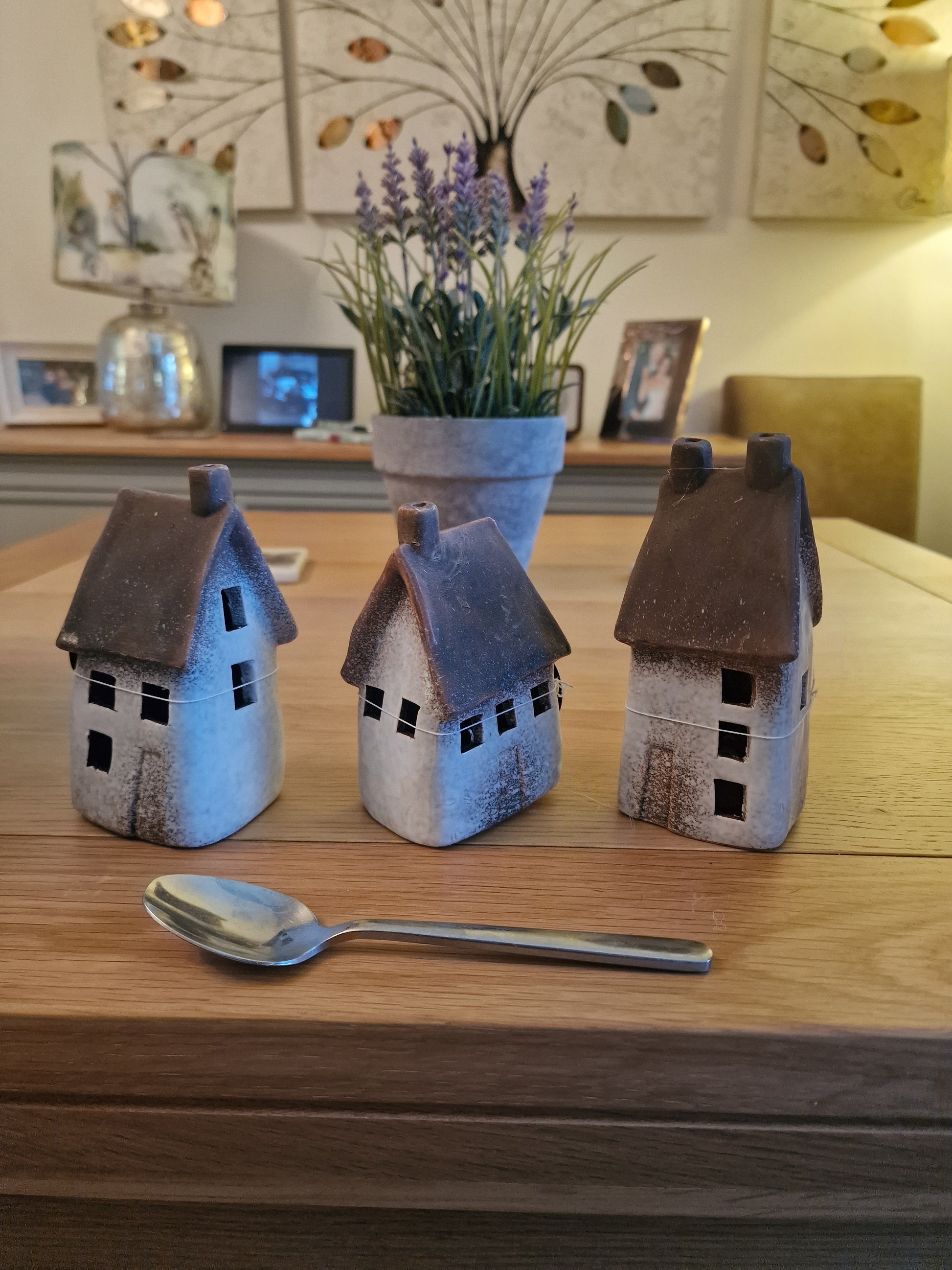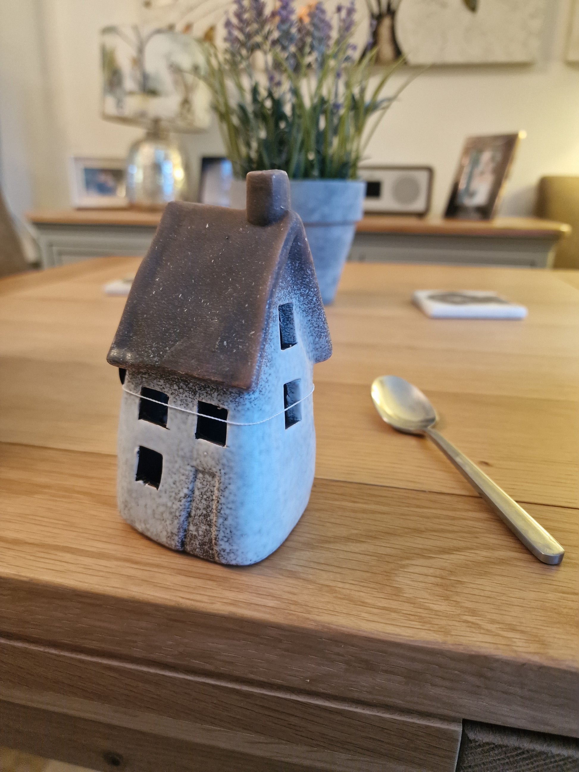 Boasting a speckled white design, these wonky cottage ornaments add a touch of uniqueness and charm, making it a must-have for any interior design lover. While its warm and speckled white LED bulbs provide ample illumination for a cozy and inviting atmosphere.  This item has been hand finished with care meaning each object is unique with its own individual imperfections. A truly one-of-a-kind piece with a rustic aesthetic.  3 Random designs, sold individually  Size: 14.5 cm