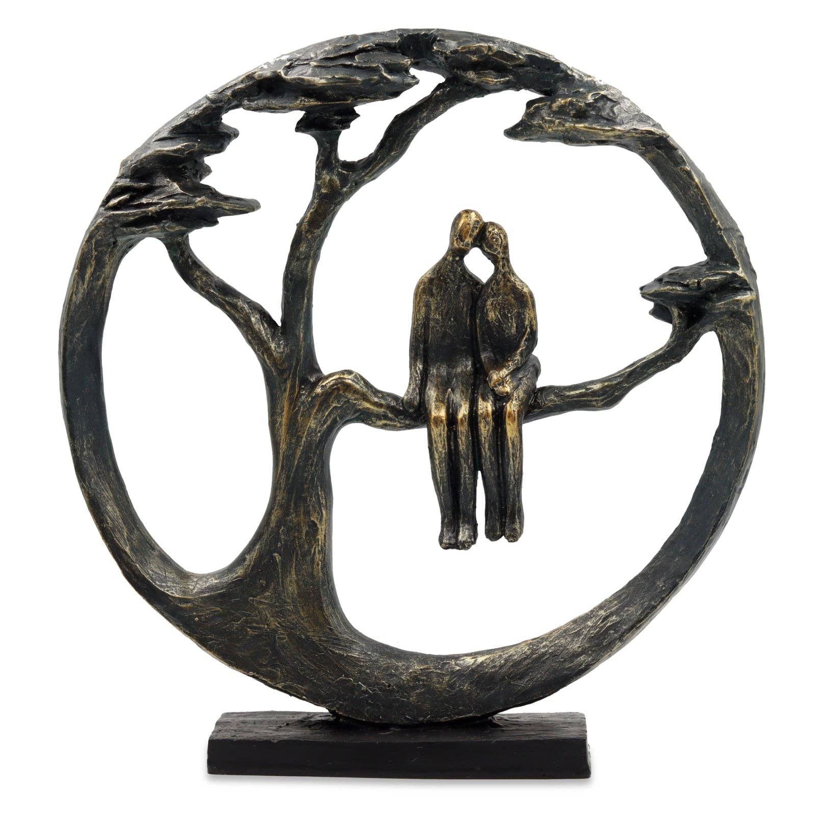 This gorgeous sculpture captures a couple sitting in a tree. Material: Poly Resin Dimensions: H 31cm x W 31cm x D 6cm Colour: Bronze/Wood effect