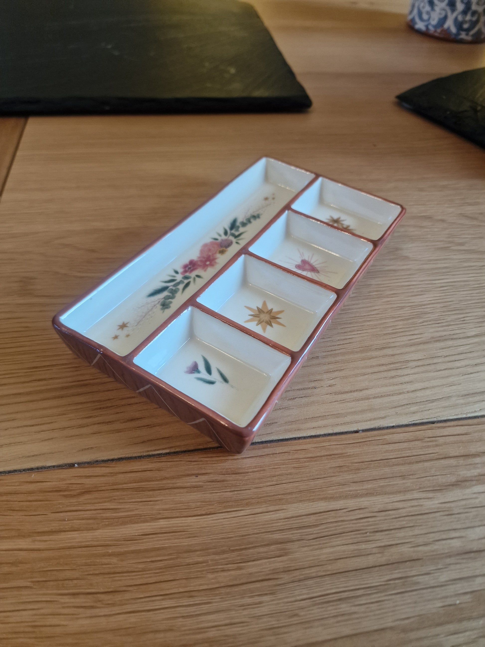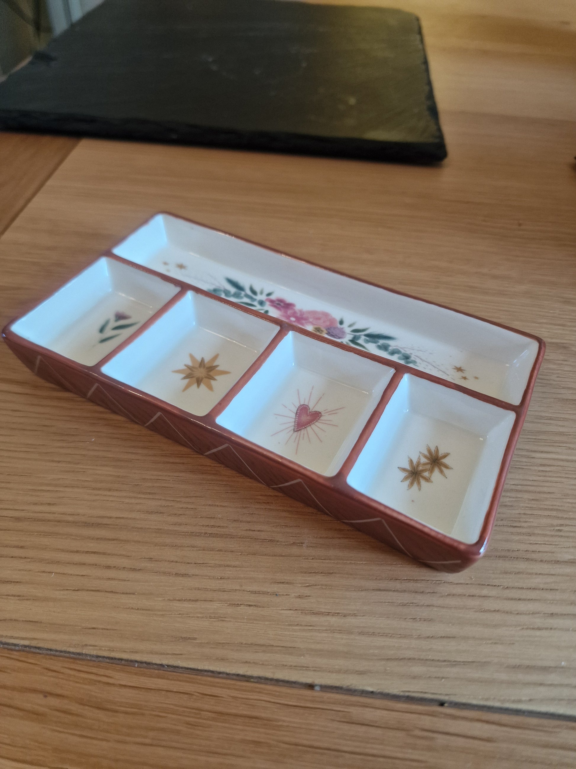 Beautiful floral heart ceramic trinket tray By Lis Angel, with 5 compartments for rings, earrings, necklaces and keys. Perfect bedside storage. 15cm wide, quality ceramic construction.
